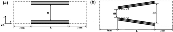 狹縫孔由半有限狹縫孔由兩個平行的石墨壁組成。每個壁包含三個石墨烯層,如圖1(a)所示?虻奶摼表示模擬框在y和z方向上的邊界。周期性邊界條件僅適用于x方向。兩個開口端與大塊氣藏相連,每個氣藏沿y軸的長度為3nm,孔隙寬度決定了z方向的尺寸。因此,通過孔內分子與體相的相互作用,可以在孔和周圍環(huán)境之間保持機械平衡。孔徑H是指通過一個壁最內層中碳原子中心的平面與相對壁的相應平面之間的距離。楔形孔在圖1(b)描繪了一個開放的楔形孔及其結構參數:小端(SH)和大端(BH)的孔徑,軸向孔長(L)和半角(α)?虻奶摼表示模擬框在y和z方向上的邊界。與狹縫孔一樣,開口端周圍的氣體沿y軸的長度為3nm,大端的寬度決定了z方向的尺寸。沿軸向(即,y方向)的孔長度是有限的L,而在x方向上的尺寸在應用周期性邊界條件的情況下假定為無限。