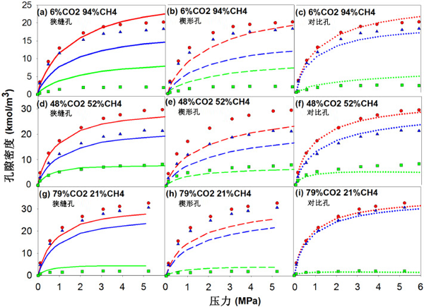 圖3:混合氣體在T=25℃在狹縫孔、楔形孔中的吸附等溫線 和理想吸附在93kPa至6.077MPa的壓力范圍內的預測值,以及從它們的混合物中吸附的CO2和CH4。