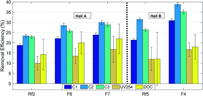 活性炭對所有光學(xué)活性(吸收/發(fā)熒光)有機(jī)物和有機(jī)碳的總體去除效率如圖2所示。該圖上的誤差條表示由誤差傳播方法計算的標(biāo)準(zhǔn)誤差,并且對于熒光測量而言最小。圖2表明,與有機(jī)碳代表的較寬有機(jī)物池和不發(fā)熒光的UV吸收分?jǐn)?shù)相比,本研究中的生物過濾器優(yōu)先去除有機(jī)物組分。有機(jī)碳的相對低的去除表明大部分有機(jī)物池由非熒光部分組成,具有相對差的去除。然而,在活性炭補(bǔ)充后,包括有機(jī)碳在內(nèi)的所有三種級分的去除均得到改善,表明對有機(jī)物去除具有積極的總體影響。由于沒有與新活性炭相關(guān)的生物去除,增加的去除最可能歸因于吸附到新的活性炭過濾材料上。