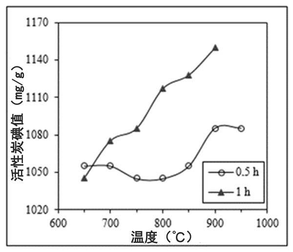 圖2:活化時(shí)間(0.5和1h)對用H 2 SO 4(在50°C下30%v / v)洗滌的廢活性炭的碘值(mg I 2/g活性炭)的影響在不同溫度(650°C至950°C)下重新活化。
