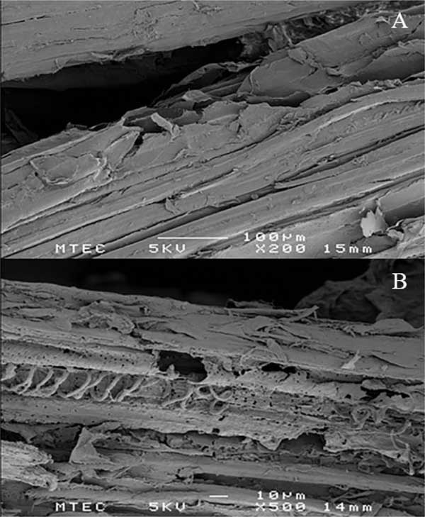 如圖3所示,將通過分離獲得的固相微結(jié)構(gòu)通過SEM與天然RH進(jìn)行了比較;钚蕴吭牧咸峁┝苏G彝暾谋砻,表明植物材料的高度有序的完整結(jié)構(gòu)(圖3A)。分離的固體殘余物的生物質(zhì)的表面結(jié)構(gòu)顯示出表面和內(nèi)部結(jié)構(gòu)的破壞,并具有空腔和裂紋。該觀察結(jié)果表明半纖維素的去除和表面木質(zhì)素的改變。對于BET表面積測量,分析了原始和預(yù)處理的生物量樣品。