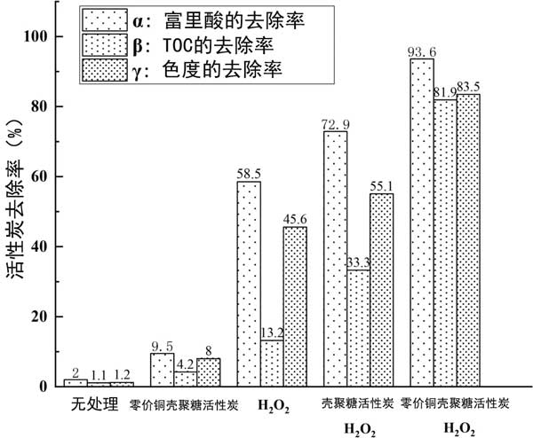 富里酸、TOC、色度的去除率分別以α、β、γ表示,如圖2所示 。從圖中可以看出,氧化劑H 2 O 2 的加入是至關(guān)重要的。實(shí)驗(yàn)組用H 2 Ø 2倍加有較好的去除富里酸,TOC和色度相比,有活性炭催化劑的組比沒有催化劑的組實(shí)現(xiàn)了更高的去除率。三個(gè)指標(biāo)的去除率都有所提高,尤其是TOC的去除率明顯提高,從13.2%提高到81.9%,說明零價(jià)銅的加入可以大大提高催化濕氧化法反應(yīng)中富里酸的礦化率。相同條件下,礦化率比無零價(jià)銅實(shí)驗(yàn)組高近2.5倍。零價(jià)銅對富里酸降解和脫色也有明顯效果。結(jié)果表明,本研究制備的零價(jià)銅殼聚糖活性炭催化劑對富里酸去除和有機(jī)化合物礦化具有較高的催化活性。