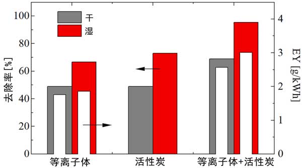 圖2:在干燥和潮濕條件下,單獨(dú)使用等離子體、活性炭和使用活性炭的等離子體對甲乙酮的去除(彩色條)和能量產(chǎn)率(白色條)。
