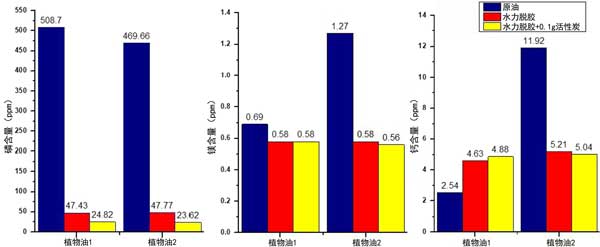 磷含量在兩個(gè)兩種植物油中主要由以所示的處理(水重量2%+活性炭0.1克)后減少圖2。植物油1的磷含量降低了大約95.22%,而植物油2的磷含量降低了大約相同的值(94.98%)。油液經(jīng)水脫膠后Mg、Ca含量略有下降,而Ca處理后略有升高。這一結(jié)果可能是由于在處理過(guò)程中活性炭中存在一些Ca解離回油相;钚蕴繉(duì)磷含量的大量降低是由于NaOH改性的活性炭具有極性、帶正電荷的表面。由于存在芳環(huán)簇和固有缺陷,它還具有磁力。在脫膠過(guò)程中將活性炭添加到植物油和水中時(shí),活性炭的芳環(huán)簇中的離域電子產(chǎn)生磁矩,強(qiáng)烈誘導(dǎo)磷脂磷酸頭部周?chē)捻槾判匝酢M瑫r(shí),活性炭的極性/親水性也允許與極性水分子相互作用。水分子也被磁場(chǎng)激活,從而發(fā)生氫自旋從旁水到鄰水的重新定向,從而降低水的抗磁性;钚蕴空T導(dǎo)的這種磁場(chǎng)會(huì)導(dǎo)致表面張力降低,削弱水分子的分子內(nèi)能。結(jié)果,更多的水分子被分解成H+離子和OH-離子,促進(jìn)更多水解反應(yīng)。這些現(xiàn)象與其他力量相結(jié)合:熱能和離心也會(huì)引發(fā)磷脂分子內(nèi)的鍵斷裂,導(dǎo)致磷酸頭部基團(tuán)從磷脂分子上分離(脫磷脂)。