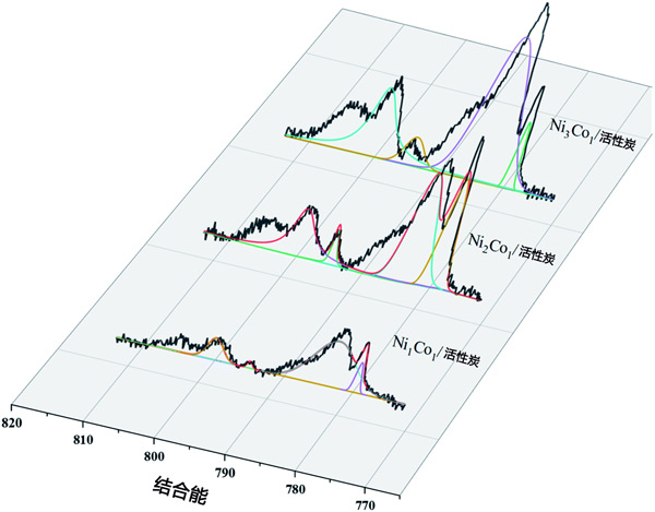采用X射線光電子能譜(XPS)對多種活性炭催化劑進(jìn)行表面分析,并對鎳和鈷進(jìn)行表征氧化態(tài)。Ni02p光譜表現(xiàn)出兩個貢獻(xiàn),2p1/2和2p3/2(由自旋軌道分裂產(chǎn)生),分別位于870eV和852.4eV(圖1a-d),可以分配給存在金屬鎳。O1s峰和Ni2+的存在,這可以通過在873.8eV(Ni2+2p1/2)和852.8eV(Ni2+2p3/2)的主峰上觀察到的肩峰來證明,表明樣品在暴露于大氣層。類似地,催化劑中Co2p的XPS光譜(圖2)顯示出四個主峰,結(jié)合能分別為778.45eV、782.7eV、793.66eV和798eV,對應(yīng)于Co02p3/2、Co2+2p3/2,Co02p1/2和Co2+2p1/2。此外,根據(jù)載鎳活性炭,已觀察到載鎳鈷活性炭的結(jié)合能偏移隨著鈷負(fù)載量的增加而增加,最大偏移約為0.3eV。在比較這些樣品時,從載鎳活性炭到載鎳鈷活性炭向更高結(jié)合能的轉(zhuǎn)變提供了鎳、鈷和載體物質(zhì)之間相互作用的證據(jù)。