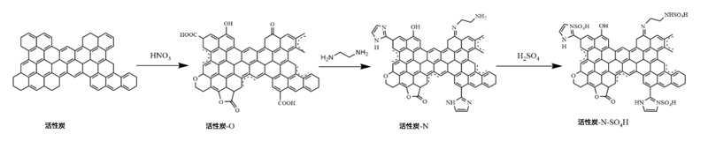 以活性炭為原料,用HNO3氧化,用乙二胺胺化。得到的中間體用硫酸水溶液處理以產(chǎn)生硫酸氫活性炭催化劑。通過(guò)過(guò)濾分離產(chǎn)物并在105℃干燥24小時(shí);钚蕴康木唧w制備方案如圖1所示。