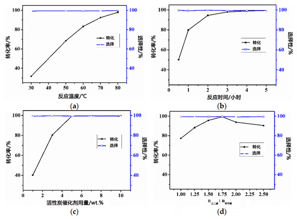 圖2:反應(yīng)條件對(duì)苯甲醛轉(zhuǎn)化率的影響。(a)反應(yīng)溫度、(b)反應(yīng)時(shí)間、(c)催化劑用量、(d)乙二醇/苯甲醛的摩爾比。