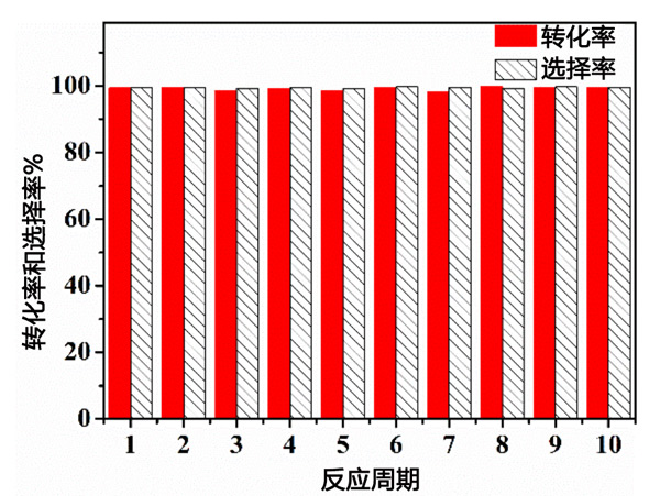 最后通過(guò)回收實(shí)驗(yàn)測(cè)試了活性炭催化劑的穩(wěn)定性,測(cè)試結(jié)果如圖3所示。在催化劑可重復(fù)使用性能的探索中,活性炭催化劑用溶劑環(huán)己烷洗滌,然后進(jìn)入下一個(gè)反應(yīng)循環(huán)。具體過(guò)程為將反應(yīng)完成后的固體離心分離出來(lái),再用環(huán)己烷洗滌固體3次,以完全去除前一輪反應(yīng)表面殘留的少量液體。即使在連續(xù)運(yùn)行10次后,催化劑的性能也沒(méi)有顯著降低,仍然達(dá)到99%的苯甲醛轉(zhuǎn)化率和99%的選擇性。因此,活性炭催化劑是用于研究苯甲醛乙二醇縮醛反應(yīng)的優(yōu)異且穩(wěn)定的可回收固體酸催化劑。