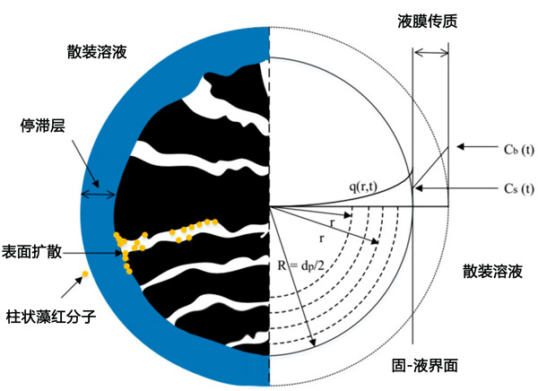 在第一實(shí)驗(yàn)階段獲得的吸附平衡測(cè)試的實(shí)驗(yàn)數(shù)據(jù)適合等溫線模型Langmuir、Freundlich和Redlich-Peterson。將最適合吸附平衡數(shù)據(jù)的等溫線模型的參數(shù)值應(yīng)用于HSDM模型,以模擬SBA柱中的吸附過(guò)程。該模型考慮了發(fā)生在兩個(gè)連續(xù)擴(kuò)散步驟中的吸附過(guò)程,即:通過(guò)活性炭顆粒周?chē)墓潭黧w層擴(kuò)散(膜擴(kuò)散)和通過(guò)活性炭?jī)?nèi)部孔的擴(kuò)散(表面擴(kuò)散),如圖2所示。