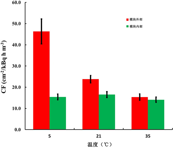 對(duì)于實(shí)驗(yàn),使用三種活性炭的織物為探測(cè)器設(shè)計(jì)了單獨(dú)的模塊。對(duì)于前兩種活性炭,模塊是HDPE,對(duì)于第三種活性炭,模塊是LDPE。單獨(dú)設(shè)計(jì)遵循上述方法,考慮到每種活性炭織物的確切單獨(dú)質(zhì)量。在所有設(shè)計(jì)中,不同溫度下的k(T)值根據(jù)方程式計(jì)算;钚蕴康慕Y(jié)果如圖2所示。5℃時(shí)的CF0比35℃時(shí)的CF0高305%。相比之下,對(duì)于放置在補(bǔ)償模塊中的傳感器,CF的變化在17%以內(nèi)(最大值/最小值=1.17)。值得注意的是,在模塊內(nèi)部不同溫度下暴露的傳感器的CF之間的配差異在95%的顯著性水平上沒(méi)有統(tǒng)計(jì)學(xué)意義。發(fā)現(xiàn)所描述的帶有補(bǔ)償模塊的探測(cè)器的CF明顯高于其他常用的無(wú)源氡探測(cè)器。