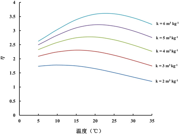 查看活性炭的檢測(cè)器的結(jié)果(圖2)可以看出,相同溫度下的CF0在活性炭之間存在差異。這意味著不同活性炭的吸附能力存在一些差異。在所有模塊設(shè)計(jì)中,假設(shè)21℃下的吸附容量值為4m3/kg-1。然而,由于我們的實(shí)驗(yàn)結(jié)果表明不同活性炭材料的k可能存在差異。不同k值的結(jié)果如圖3所示。可以看出,對(duì)于區(qū)間2-6m3/kg-1內(nèi)的所有k值,η的變化(例如最大/最小比率)與溫度的變化遠(yuǎn)小于未包裝傳感器觀察到的230-305%的變化。