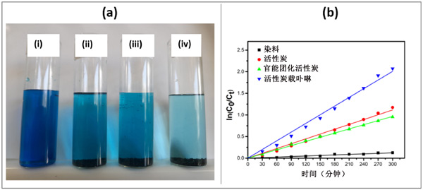 圖3:(a)過濾可見光照射5小時(shí)后MB溶液的照片。(i)單獨(dú)的MB,(ii)MB與活性炭,(iii)MB與官能團(tuán)化活性炭,和(iv)MB與活性炭載卟啉,(b)亞甲藍(lán)降解的動(dòng)力學(xué)線性模擬曲線。