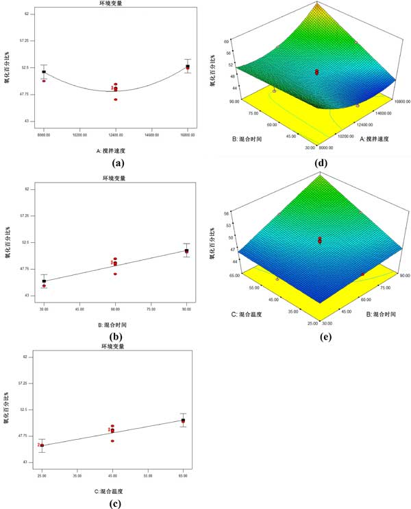圖2:(a)混合速度、(b)混合時(shí)間和(c)混合溫度與活性炭催化氧化百分比相關(guān)的模型圖和(d)混合時(shí)間和混合速度和(e)相互作用的影響的3D模型圖。
