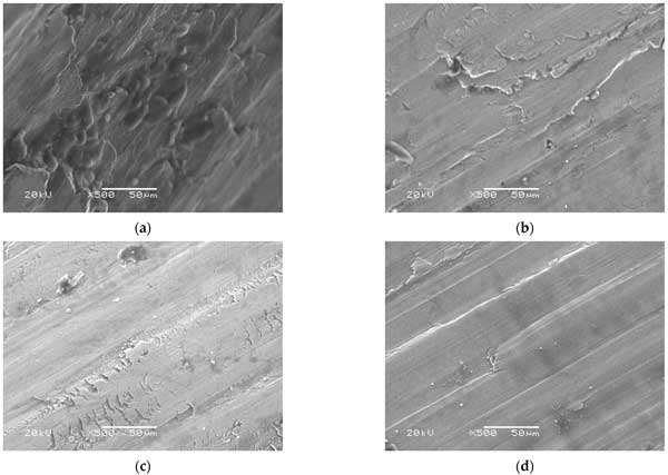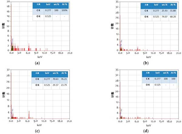 通過(guò)觀(guān)察摩擦學(xué)測(cè)試的結(jié)果,很明顯平均磨痕直徑和質(zhì)量損失的減少結(jié)果具有相似的趨勢(shì)。然而,當(dāng)將活性炭添加到潤(rùn)滑脂中時(shí),質(zhì)量損失值顯示出更陡峭的趨勢(shì)。為了進(jìn)一步了解質(zhì)量損失結(jié)果以及表面的磨痕形貌,應(yīng)用了與能量色散X射線(xiàn)(EDX)系統(tǒng)集成的SEM。測(cè)試氣缸磨痕的EDX光譜是針對(duì)放大500倍的SEM圖像確定的,以便從磨痕的表面軌跡中獲得關(guān)于接觸表面上的摩擦膜的沉淀元素(碳和氧)的必要信息。圖3顯示了以500倍放大倍率成像時(shí)的磨損表面形態(tài)。在具有粗糙表面形態(tài)的商業(yè)油脂樣品的情況下,圖像描繪了淺槽和深槽(圖3a)。另一方面,活性炭樣品和2wt.%其他樣品的磨損表面(圖3b,c)顯示出淺槽,帶有少量深槽點(diǎn)和光滑的形貌,而在0.5wt.%活性炭+2wt.%其他樣品的混合樣品僅顯示出薄槽(圖3d)。