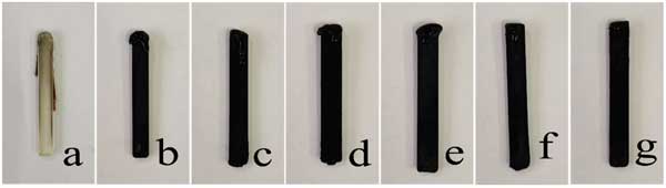 圖2:極限氧指數測試后復合材料的數字圖像:(a)聚乳酸,(b)添加活性炭3%,(c)添加活性炭6%,(d)添加活性炭9%,(e)添加改性活性炭3%,(f)添加改性活性炭6%,(g)添加改性活性炭9%。