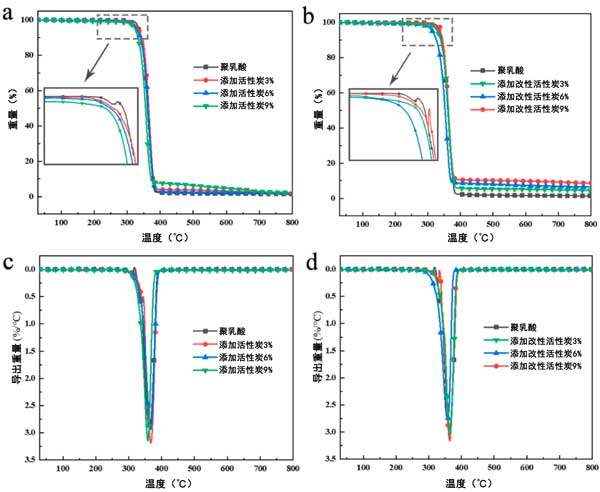 熱重分析結果列于圖3中。所有樣品均呈現單一熱降解階段,但5%質量損失溫度(T5%)或熱降解速率最高溫度(Tmax)略有不同。純聚乳酸在322℃時開始快速降解,如圖3a所示,其Tmax達到363℃,并且在400℃時幾乎所有質量都損失了。在800℃的終端溫度下測得相應的殘?zhí)柯蕛H為1.35%。相比之下,當應用改性活性炭時,酸性添加劑(磷酸鹽)會促進聚乳酸復合材料的較早分解,這與之前的結果一致。殘?zhí)柯孰S著復合材料中改性活性炭的加載而逐漸增加。純聚乳酸和改性活性炭復合材料的Tmax幾乎沒有差異,分別為363℃、364℃、357℃和363℃。因此可以看出,改性活性炭負載對聚乳酸降解沒有影響。在600℃到800℃的范圍內,聚乳酸燃燒的殘余物沒有質量變化,但在一定程度上可以觀察到輕微的質量損失,表明加入改性活性炭后復合材料的燃燒延遲。