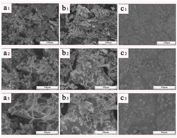 當加載足夠的改性活性炭時,膨脹的殘余碳可以通過其質量、連續(xù)性和致密性得到證實,這些都得到了極大的改善。一般來說,膨脹的殘余碳可以減少凝相和氣相之間潛在的熱和傳質,這反過來又會引起燃燒抑制。經過錐形量熱儀測試后如圖4中的圖案所示,可以注意到殘留碳的顯著形態(tài)差異。在改性活性炭6%和改性活性炭9%的表面上可以看到空隙和裂口(圖4a1、b1),它們可以作為熱量的擴散途徑,并且在燃燒過程中會揮發(fā)。此外,相比之下,改性活性炭9%在表面提供了精細的皺紋覆蓋層(圖4c1),這產生了有效的凝聚相阻燃性,此外,皺紋形態(tài)可以作為復合材料的增強框架。