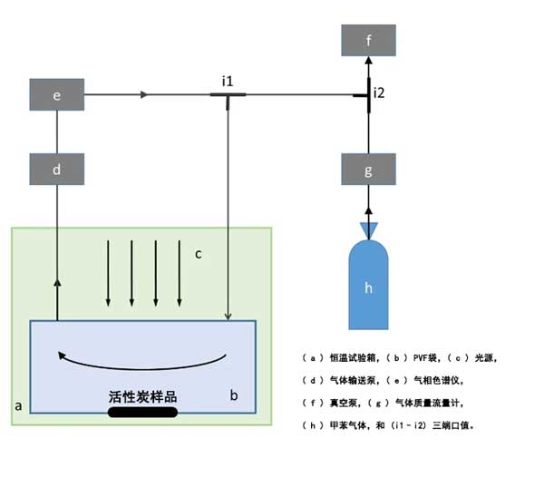 系統(tǒng)研究了活性炭復(fù)合材料的光催化性能。為了模擬實(shí)際應(yīng)用,在恒溫試驗(yàn)箱中將不銹鋼罐替換為60L聚氟乙烯袋,并保持恒溫(例如20℃)。然后,將3g活性炭微粒放在盤(pán)子上并放入袋中。入射光可以穿過(guò)PVF薄膜到達(dá)活性炭表面。其結(jié)構(gòu)如圖1所示。為了測(cè)試光催化活性,反應(yīng)器首先用泵抽真空。然后,注入60L甲苯氣體(空氣中50.0ppm)作為目標(biāo)室內(nèi)污染物。這需要大約12分鐘。之后,將反應(yīng)器在黑暗中保持0.5小時(shí)以達(dá)到吸附/脫附平衡。使用300W氙氣燈作為模擬日光源。使用氣相色譜儀定期分析反應(yīng)器中的氣體產(chǎn)物。此外,口袋中的甲苯氣體還不能完全流到氣相色譜儀的自動(dòng)氣體進(jìn)樣閥,因?yàn)樵撻y的管徑比較小,輸氣泵剛剛啟動(dòng)。因此,甲苯濃度低。