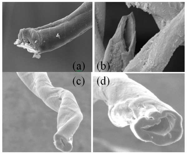 通過煅燒和HNO3、H2O2和KOH活化,廢棉纖維成功轉(zhuǎn)化為不同結(jié)構(gòu)的活性炭。圖1顯示了三種活性炭的SEM圖像?梢钥闯,化學(xué)活化有助于大孔隙的形成。在整個(gè)纖維長度上可以觀察到一個(gè)空心芯,直徑約為0.5–5.0µM,形狀幾乎為圓形;钚蕴烤哂懈叨榷嗫椎慕Y(jié)構(gòu),核心直徑在大約0.5和5μM之間(圖1b,d)。這種大孔隙率可能與纖維內(nèi)壁木質(zhì)素的化學(xué)破壞有關(guān)。參考活性炭(圖1a)呈現(xiàn)大孔隙,而形態(tài)特征是纖維中芯的出現(xiàn),其直徑取決于活化劑。使用過氧化氫作為活化試劑獲得最大直徑(圖1b)。如圖1b-d所示,前體的結(jié)構(gòu)(最初具有干凈的表面)在每次化學(xué)處理后都會(huì)被破壞。有趣的是,其中一種活性炭的表面在化學(xué)活化的影響下發(fā)生明顯變化(與其他活性炭相比)。