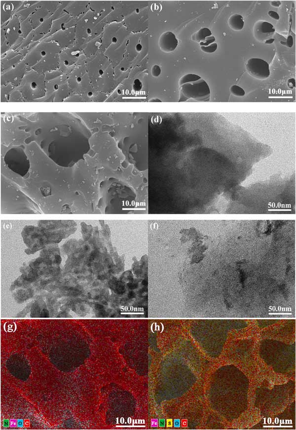 圖1:使用SEM和TEM(a,d)去木質(zhì)活性炭(b,e)磁性活性炭(c,f)去木質(zhì)炭圖像;元素(C、O、N、Fe、S)的映射分析:磁性活性炭(g)和磺胺嘧啶吸附的磁性活性炭(h)。