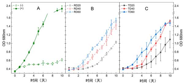 厭氧消化物中存在的大量和微量營養(yǎng)素的多樣性可能有利于藍藻代謝。即使活性炭預處理顯著降低了幾個參數(shù),包括COD、濁度和苯酚含量,原料(4405mg/L)和預處理消化物(4220mg/L)的銨濃度仍然高于藍藻螺旋藻支持的閾值濃度(100–150毫克/升)。在這種情況下,使用以三種不同稀釋率稀釋的原始和預處理消化物進行了一系列藍藻毒性測定:20×、40×和60×。未稀釋的消化物,無論是否用活性炭處理,都沒有在本實驗中進行測試,因為初步培養(yǎng)分析表明它們對培養(yǎng)物毒性太大(數(shù)據(jù)未顯示)。因此,該實驗的目的是比較以不同稀釋率稀釋的兩種消化物以及兩個對照組之間的生長性能。連續(xù)測量680nm處的OD超過10天,以評估所有條件下的生長情況。在三種不同稀釋因子下測試的原始消化物(RD)和處理過的消化物(TD)條件下,觀察到類似生長趨勢(圖2A、B)。當增加原始和預處理消化物的培養(yǎng)基稀釋倍數(shù)時,會產(chǎn)生更高的生長反應。同樣,滯后期受原始消化物和預處理消化物的稀釋因子的影響,觀察到的滯后期越長,消化物越濃縮。例如,稀釋20倍和40倍的未處理消化物的滯后期分別持續(xù)4天和2天。在本研究中,根據(jù)稀釋倍數(shù)和預處理條件,使用221和71mg/L之間的初始銨氮(NH4+-N)濃度,鈍頂藻能夠增殖。一般而言,原始消化物和預處理消化物的更高稀釋度產(chǎn)生更高的生長。