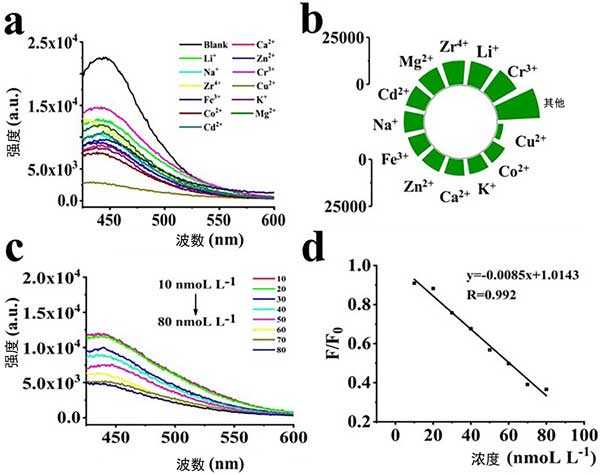 圖2:(a)12種金屬離子的納米活性炭點(diǎn)的熒光發(fā)射光譜,(b)360nm處的熒光強(qiáng)度,(c)不同濃度Cu2+的熒光發(fā)射光譜,(d)Cu2+檢測(cè)的線性曲線。
