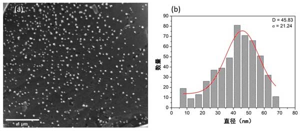 圖2:具有1微米比例尺的SEM圖像顯示納米粒子在活性炭上的均勻分布(a)以及通過對活性炭混合納米雜化材料的SEM直方圖進行高斯擬合獲​​得的尺寸分布(b)。