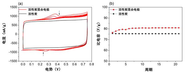 通過評估電化學性能,初步測試了活性炭復合材料作為混合電極的潛在應用。為此,通過將浸泡在1M/H2SO4電解質中的隔膜夾在兩個相同的電極(活性炭或混合材料)之間來組裝對稱電池。圖3a顯示了活性炭和混合材料在20mV/s恒定掃描速率下的循環(huán)極化(CP)曲線。由于雙電層電容(EDLC)的影響,交流對稱電池的CP曲線形狀為矩形。另一方面,活性炭混合電極觀察到準矩形CP曲線NPs對稱細胞,具有源自納米銀的各種氧化還原波,與矩形(電容)包絡重疊。這種CP結構表明法拉第和EDLC兩種電荷存儲機制的共存。值得注意的是,隨著循環(huán)次數(shù)的增加,觀察到的銀波變得更小并且變得難以察覺,這表明存在一定程度的不穩(wěn)定,正如對游離多金屬氧酸鹽納米銀所觀察到的那樣。白銀波浪的減少之間存在相關性(圖3a)在前幾個周期內,根據(jù)CP面積計算出的比電容有所增加(圖3b)。這可以通過氧化銀薄層與銀的比電容差異來解釋。盡管如此活性炭混合電極的比電容略高于裸活性炭電極,活性炭的比電容為75F/g,活性炭混合電極在20次循環(huán)后達到81F/g。該結果表明,混合材料具有電活性,并且在對稱超級電容器配置中超過了一定程度的交流電;钚蕴亢突旌想姌O電池的比電容隨著電流密度的增加而降低。對于活性炭混合材料在掃描速率為2mV/s時最高值為83.5F/g,在掃描速率為50mV/s時進一步下降至77.5F/g。高掃描速率下比電容的降低歸因于電解質離子的低擴散。由于時間限制,高倍率充放電過程中電解液中的離子運動始終受到擴散限制,僅利用外層活性表面進行電荷存儲。減慢掃描速率可以讓電解質更徹底地滲透到孔隙中,并與電極材料的內表面有更多的接觸,從而導致電極表面存儲更多的電荷(更大的電容)。