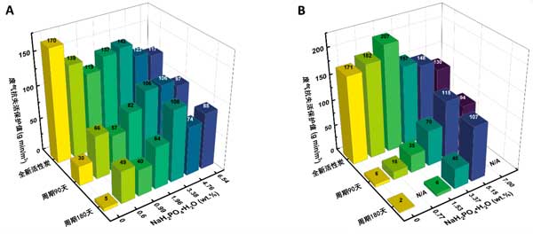 圖1:磷酸鹽添加劑(NaH2PO4·H2O)濃度對(duì)新的和浸漬的活性炭的防護(hù)值的影響。(A)改性活性炭,(B)活性炭。