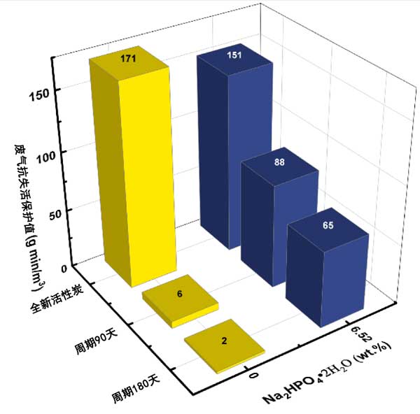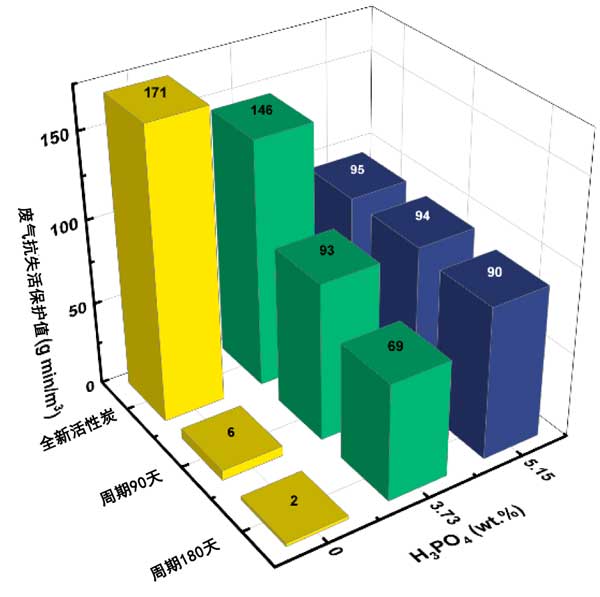 使用Na2HPO4·2H2O添加劑的實(shí)驗(yàn)在6.52%的濃度下進(jìn)行,其摩爾當(dāng)量相當(dāng)于5.15%的NaH2PO4·H2O濃度。圖3的結(jié)果表明,Na2HPO4·2H2O添加劑也能有效防止失活,但不如NaH2PO4·H2O有效。例如,失活180天后,防護(hù)值含有Na2HPO4·2H2O添加劑的活性炭濃度下降至65mg/min/m3相比之下,使用NaH2PO4·H2O添加劑的活性炭為107mg/min/m3。