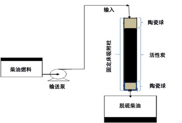 控制排放流量并且固定床吸附塔裝置中的流量保持恒定以達(dá)到穩(wěn)態(tài)條件。在接近穩(wěn)態(tài)條件時從固定床吸附塔裝置出口采集產(chǎn)品樣品并準(zhǔn)備用于硫含量分析。為了確認(rèn)脫硫?qū)嶒灲Y(jié)果的準(zhǔn)確性,每次運(yùn)行重復(fù)脫硫運(yùn)行兩次。運(yùn)行完成后關(guān)閉計量泵,并將所有打開的閥門設(shè)置為關(guān)閉。