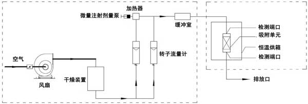 動(dòng)態(tài)吸附實(shí)驗(yàn)在室溫(25℃)下進(jìn)行。實(shí)驗(yàn)裝置由氣體分配系統(tǒng)和吸附系統(tǒng)兩部分組成。吸附系統(tǒng)由恒溫箱和吸附單元組成。檢測(cè)口位于吸附系統(tǒng)之前和之后。動(dòng)態(tài)法測(cè)定活性炭對(duì)脈沖負(fù)荷緩沖性能的裝置如圖1所示。本實(shí)驗(yàn)以乙醇或二甲苯為單一檢測(cè)對(duì)象。氣體分配系統(tǒng)包括風(fēng)扇、干燥裝置、轉(zhuǎn)子流量計(jì)、微注射計(jì)量泵、加熱器和緩沖室。使用FT-IR傅里葉氣體分析儀作為測(cè)量設(shè)備。在氣體分配系統(tǒng)中,在短時(shí)間內(nèi)(2分鐘和5分鐘),微注射計(jì)量泵的注射量迅速增加到原始體積的預(yù)定倍數(shù)(10倍和20倍),以產(chǎn)生脈沖負(fù)載。在吸附系統(tǒng)中,吸附單元內(nèi)放置活性炭。吸附單元的直徑為31mm;钚蕴康奶畛涓叨确謩e為2cm、4cm、6cm、8cm。將吸附裝置置于恒溫箱內(nèi)。吸附劑和吸附物的入口空氣保持在室溫。進(jìn)行了吸附劑在室溫下吸附吸附質(zhì)的脈沖加載實(shí)驗(yàn)。潔凈空氣通過(guò)干燥裝置后,利用轉(zhuǎn)子流量計(jì)將其按特定比例分成兩個(gè)通道。通過(guò)微注射泵將特定濃度的乙醇或二甲苯氣體注射到氣體中。另一種氣體用作稀釋氣體。兩種氣體流入緩沖室,完全混合后進(jìn)入恒溫箱。穩(wěn)定的氣體按照實(shí)驗(yàn)設(shè)定的濃度、流量和溫度進(jìn)入吸附單元。在通過(guò)吸附單元之前和之后測(cè)量乙醇或二甲苯的濃度。