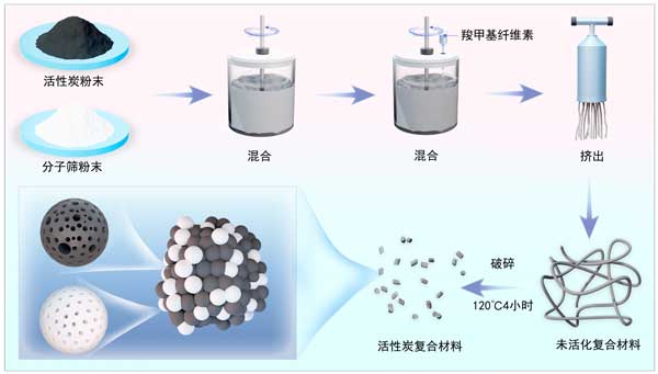 活性炭之所以特別適合用于吸附過程,是因為它具有高度多孔的無定形結(jié)構,能夠吸附各種分子。它具有微孔和中孔,可以容納各種大小的分子,補充了分子篩的孔隙特異性;钚蕴窟具有利用功能基團改變其表面化學性質(zhì)的潛力,從而增強其與目標分子的相互作用。本文以羧甲基纖維素為黏合劑,通過機械混合和擠出法制備了一系列 華活性炭分子篩復合材料(圖1)。