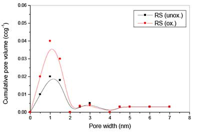 圖1:未氧化和氧化的活性炭的DFT孔徑分布。