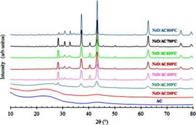 由活性炭和活性炭負(fù)載的鎳在不同的熱處理溫度下記錄的X射線(xiàn)衍射圖如圖1 所示。在200中被加熱的樣品 ℃,在2θ顯示有2個(gè)衍射峰 = 23.5和43.5°,對(duì)應(yīng)于(0 0 2),(1 0 無(wú)定形活性炭0)指數(shù)平面。另外,隨著煅燒溫度從300 ℃ 升高到800 ℃ ,反射次數(shù)增加,表明添加的催化劑在2θ = 37.1°,43.2°,62.7°和75.3° 處被氧化成氧化鎳 。這些角度分配給(1 1 1),(2 0 0),(2 2 0)和(3 1 1)面,立方晶體的氧化鎳。此外,對(duì)于400-800 ℃ 煅燒的樣品,在對(duì)應(yīng)于(2 2 2)的2θ = 79.3° 處觀察到新的峰。氧化鎳峰的強(qiáng)度也隨著煅燒溫度的增加而增加。