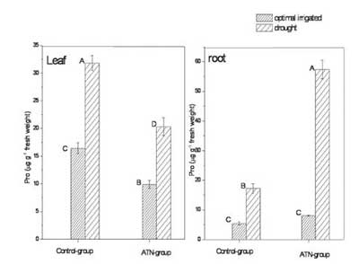 我們?cè)谒袡z查組中干旱脅迫條件下脯氨酸含量增加(圖1)。在干旱條件下,與對(duì)照組相比,活性炭混合物的存在與葉中脯氨酸含量稍低有關(guān),這表明活性炭混合物在干旱條件下有積極作用。
