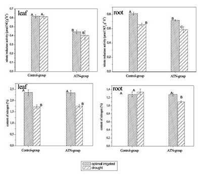 硝酸還原酶(NR)活性水平和兩個(gè)組(活性炭和對(duì)照)的葉和根中的氮含量如圖2所示。這些結(jié)果表明干旱條件誘導(dǎo)了兩個(gè)組(對(duì)照和活性炭組)的根中的硝酸還原酶活性的顯著降低,以及活性炭混合物組根部中的N吸收降低。