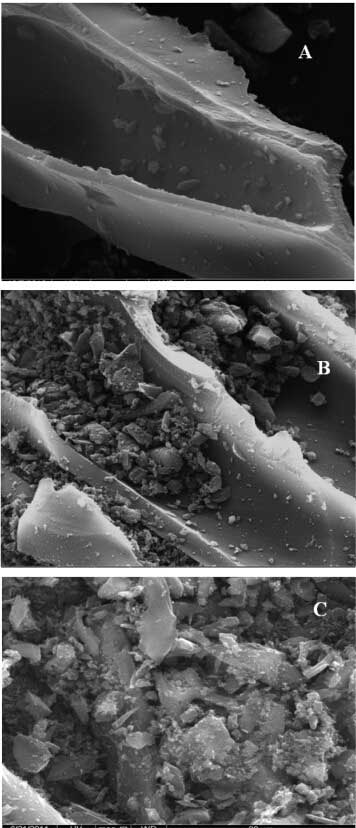 圖2。活性炭(A),改性活性炭(B)改性活性炭和PI(C)的SEM圖像(放大率= 5123×20μm)。