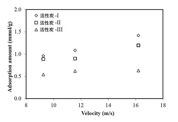 流速同時(shí)影響氣體吸附和活性炭回收,因?yàn)樗婕皻怏w和活性炭顆粒的混合程度、。圖3在各種活性炭吸附劑尺寸下,氣體去除效率和流量之間呈現(xiàn)出輕微的反比關(guān)系。最小的吸附劑(活性炭-1)以9.26米/秒除去77.4%的甲苯蒸氣,然后以16.2米/秒降至65.4%。微;钚蕴课絼┎东@沿著旋風(fēng)分離器的流動(dòng)路徑行進(jìn)的甲苯蒸氣。雖然在前面的的內(nèi)容說過吸附量以高速增加,但是氣體去除效率相當(dāng)?shù)。這是因?yàn)樵诟吡髁肯录妆降慕^對(duì)體積要高得多。因此,即使活性炭吸附得更多,更多的氣體分子傾向于流出而沒有在內(nèi)部吸收。因此,關(guān)于顆;厥蘸蜌怏w去除效率的最佳流量必須通過在各種操作條件下的眾多實(shí)驗(yàn)來確定。