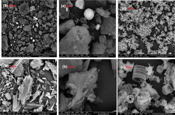 圖2:商業(yè)活性炭(a)活性炭(b)普通活性炭(c)在100和20μm放大倍率下的顯微照片。