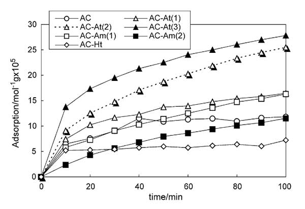 實驗條件:在N2中使用210ppm的甲硫醇作為甲硫醇氣體;钚蕴康闹苽,活性炭通過碳化隨后活化制備。用蒸汽進行活化。用HNO3/H2SO4溶液進行活性炭的酸處理。將1克活性炭在100立方厘米HNO3/H2SO4溶液中在室溫下攪拌0.5小時。過濾分離經(jīng)過處理的活性炭,并在超聲條件下用去離子水洗滌數(shù)次,直到水的pH值達到5以上。然后將活性炭在100℃空氣中干燥12小時,在150℃下真空干燥1小時。用HNO3,HNO3/H2SO4(1/1比例)和HNO3/H2SO4(1/3比率)處理的活性炭分別表示為AC-At(1.2.3)。胺化合物對活性炭的改性通過十六胺的吸附來進行。將活性炭浸入十六烷胺/乙醇溶液中并在室溫下攪拌30分鐘。然后過濾分離活性炭并在室溫下真空干燥2小時。由4×10-6和3.3×10-5摩爾m-3十六胺溶液制備的活性炭分別表示為AC-Am(1.2)。活性炭(AC-Ht)的熱處理在Ar氣氛中在600℃下進行2小時。