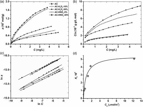 圖2.活性炭吸附銅離子研究(a)實(shí)驗(yàn)并擬合Langmuir(b)和Freundlich(c)模型和(d)KF對CA的擬合。