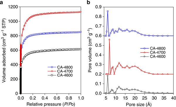 圖1、活性炭的孔隙率;罨奶急粯擞洖镃A-4T,其中4是活化KOH/碳比,T是活化溫度。顯示了氮吸附等溫線(a)和相應的孔徑分布曲線(b)。