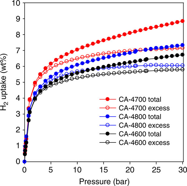 活性炭中的氫儲存需要具有最高表面積和適當尺寸的孔的材料。在-196和25℃下使用重量法在HidenXEMIS分析儀上在0-30巴的壓力范圍內研究活性炭的儲氫能力。圖2顯示了活性炭在-196℃下的過量和總氫吸收等溫線。對于所有CA-4T活性炭,氫吸收是可逆的,沒有滯后現(xiàn)象,并且在0-30巴的壓力范圍內沒有達到飽和。我們首先注意到1巴的氫吸收非常令人印象深刻,在3.1-3.9wt%的范圍內。這種儲氫比為高表面積活性炭傾向于在2-3重量%范圍內的任何報告的值高得多。我們將這種特別高的吸收特性歸因于非常高的微孔表面積和富氧表面的組合,特別是對于3.9重量%的活性炭樣品CA-4700。富氧表面的效果是對于活性炭樣品CA-4600,其盡管具有適度總表面積和微孔表面,仍然表現(xiàn)出的吸收比以前發(fā)現(xiàn)的活性炭材料具有高得多的表面積。經(jīng)過研究發(fā)現(xiàn),具有氧官能團的活性炭效果預期在低壓下具有最大效果,其中氫和表面之間的相互作用比在較高壓力下更重要,其中通過空間填充機制更可能發(fā)生氫吸收。