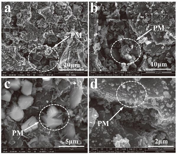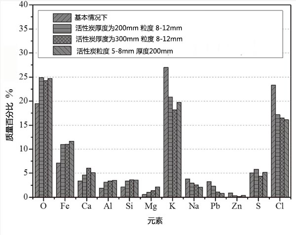 圖4顯示了煙氣通過活性炭之前和之后的化學(xué)組成?梢园l(fā)現(xiàn)PM 2.5中的+ Fe,Ca,Si,Al和Mg的含量在煙氣通過活性床時比基礎(chǔ)情況下都有所增加,而K,Na,Pb的含量, PM 2.5中的 Zn和Cl都出現(xiàn)了下降。圖5給出了煙氣經(jīng)過活性炭層后在過濾器中收集的PM 2.5的SEM圖像,觀察到經(jīng)活性炭去除后,較大顆粒的數(shù)量主要由K和Cl組成減少(圖5)(b)-5(d))與基本情況比較(圖5(a))雖然有許多較小的顆粒,如球形顆粒(圖5(d)),主要包含F(xiàn)e和Ca這種現(xiàn)象與PM 2.5的化學(xué)成分變化非常一致。此外,與使用厚度為200毫米,粒度為8-12毫米的活性炭床的情況相比(圖5(b)),出現(xiàn)了較少的大的富含K-Cl的顆粒,并且出現(xiàn)了許多較小的球形富含F(xiàn)e-Ca的顆粒。