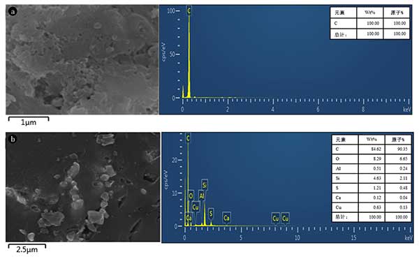首先,檢查每種吸附劑的物理化學(xué)特性。圖1顯示了制備的吸附劑的SEM圖像和EDS圖案。雖然僅活性炭吸附劑的表面僅由碳組成,而改性活性炭由碳和各種無機元素組成(圖1)。在用銅試劑修飾后,銅試劑化合物中的硫存在于改性活性炭表面上。該結(jié)果意味著銅試劑成功地吸附到活性炭表面。