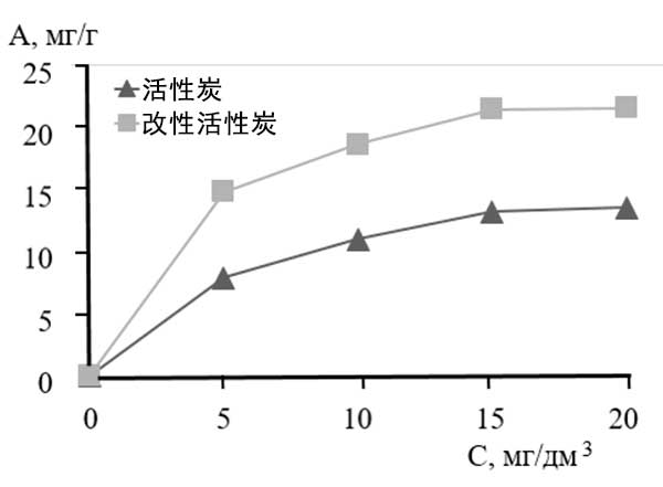 用發(fā)煙硫酸處理活性炭導(dǎo)致磺酸鹽基團(tuán)捕獲吸附劑表面和孔內(nèi)部。用二氯乙烷對活性炭的初級處理有利于磺化劑在孔深度中的滲透,從而增強(qiáng)氧化,并由此促進(jìn)磺酸鹽基團(tuán)的形成?咨疃戎谢撬猁}基團(tuán)的存在增加了吸附劑相對于汞離子的吸附能力。對于改性活性炭在靜態(tài)條件下對汞離子吸附的研究結(jié)果,根據(jù)獲得的實驗數(shù)據(jù),繪制了活性炭和改性活性炭的比較等溫線(圖1)。