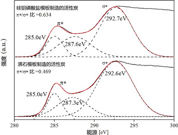 兩種模板化制造活性炭的EELS光譜在圖3顯示。這兩條曲線的sp 2/sp 3碳的分?jǐn)?shù)已經(jīng)顯示出與碳原子的雜化有關(guān),并且一系列高斯峰被擬合到下的去卷積。定量計(jì)算表明,硅鋁磷酸鹽模板化活性炭的光譜在兩個(gè)峰之間具有統(tǒng)計(jì)學(xué)上更高的比率,與無定形碳相比,這兩種活性炭的sp 2/sp 3碳具有更高比例。