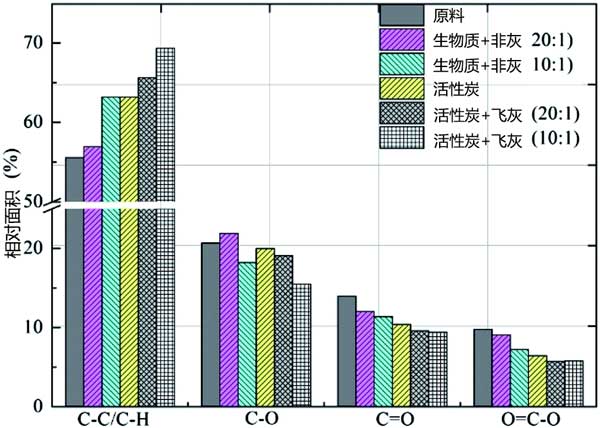 表面基團的芳香族C-C或C-H隨著活性炭原料在熱解時的比例增加以及氣體活化而增加可以從圖2中可以看出。這是預期的,在不完全燃燒和部分氧化可導致在含碳材料內形成芳族化合物。含氧官能團如C-O,C=O和O.=隨著生物炭和活性炭的煤飛灰比例增加,C-O的相對面積減小。煤飛灰似乎提高了芳構化程度,但顯著降低了羰基的相對濃度,同時保持或適度降低了酮和羧酸的性質。這可能涉及先前發(fā)現(xiàn)的用于生物質和煤飛灰的共熱解的生物燃料的增強的脫氧,并且表明活性炭的表面化學可以使用煤飛灰作為添加劑來介導。