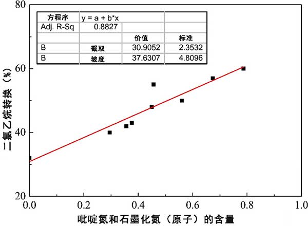 氮摻雜活性炭的活動點(diǎn)如圖3所示,隨著吡啶氮和石墨氮的增加,二氯乙烷轉(zhuǎn)化率呈線性增加,不論氮資源的變化如何,推斷吡啶氮和石墨氮與二氯乙烷的催化脫氯化氫密切相關(guān),是有效的氮原子。